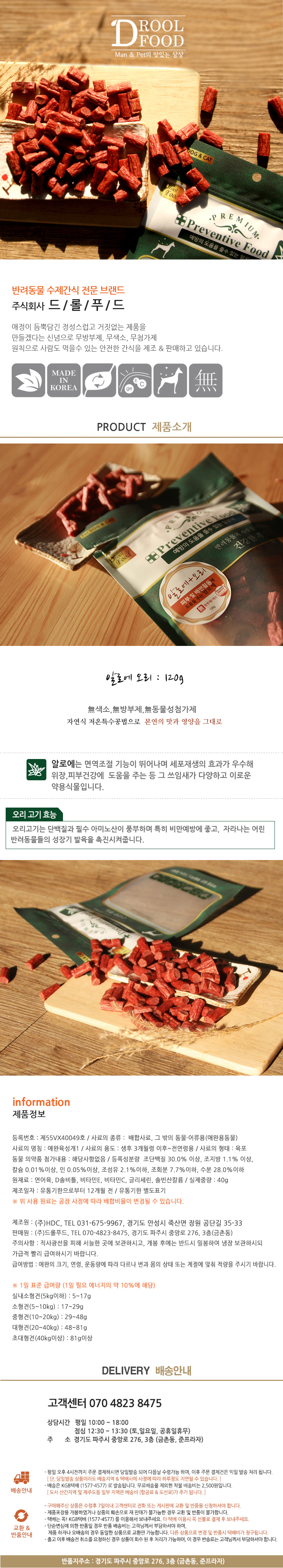 019 드롤푸드 프리벤티브푸드 알로에+오리 / 강아지,고양이겸용 / 기능성 져키간식