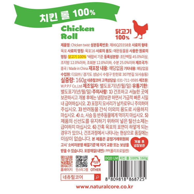 019 네츄럴코어러브미트 치킨롤 100% 160g